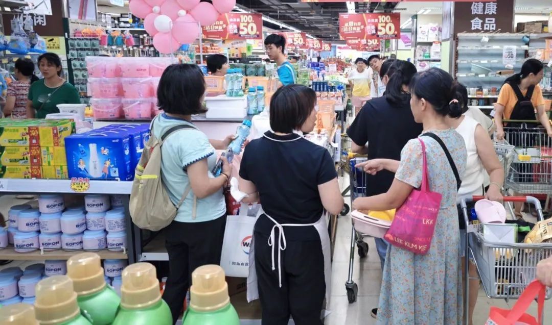 记者在现场看到,由于开展了优惠活动,现场迎来了不少顾客,商场内到处人头涌涌。陈先生表示,自己是和家人一起过来的,两架购物车都放得满满当当的。